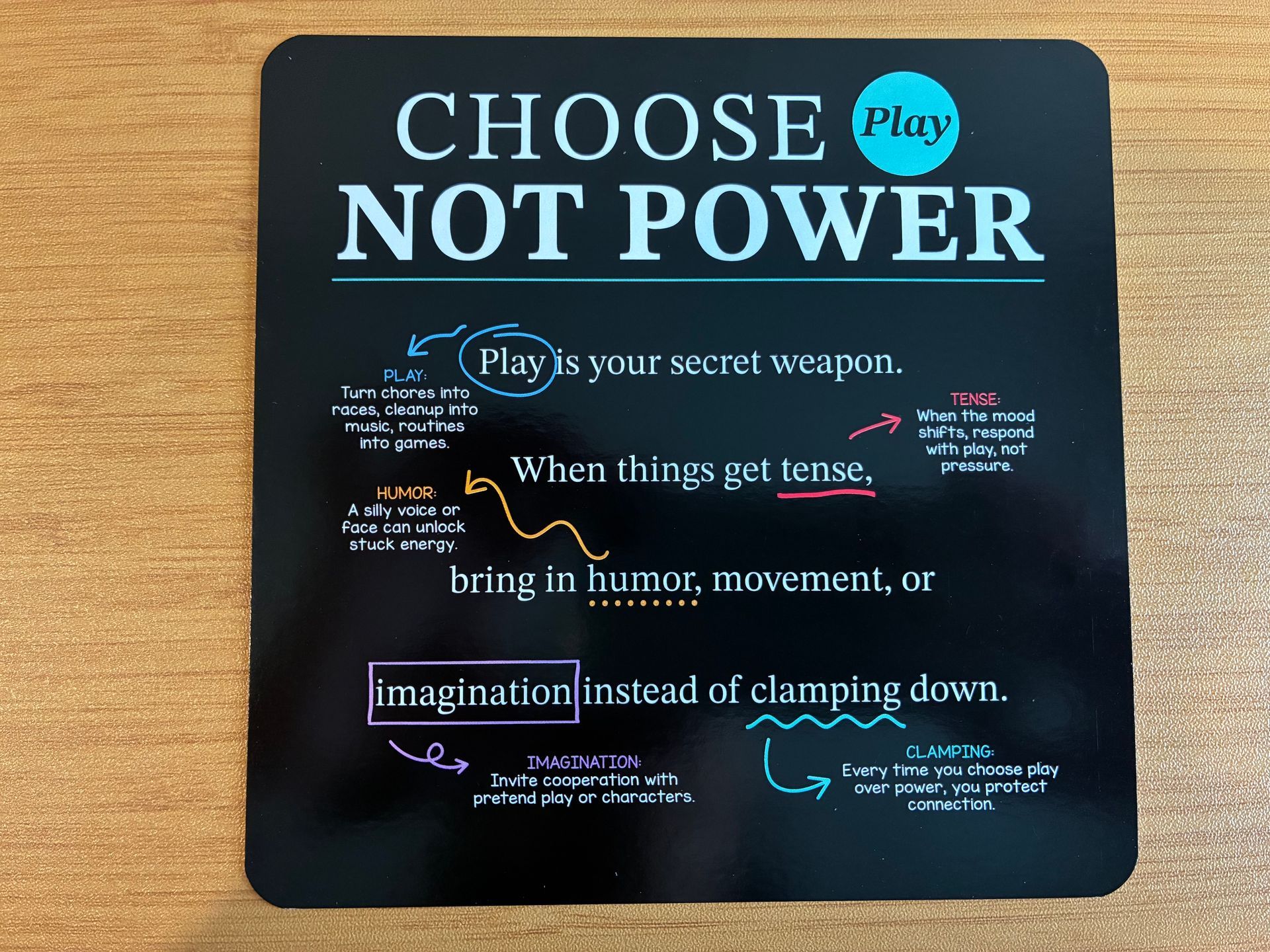 What this looks like in real homes 1) The “one more minute” spiral You say, “Time to turn the iPad off.” Your kid says, “NO!” and suddenly you’re negotiating, threatening, counting, or repeating yourself. Choose play not power looks like: You keep the boundary and shift the energy: “Okay, we’re going into Secret Agent Shutdown Mode. Your mission: press the off button with your pinky finger in 3…2…1.” Same limit. Less friction. 2) The getting-out-the-door standoff You say, “Shoes on.” Your kid wanders, melts, argues, or collapses like their legs stopped working. Choose play not power looks like: You become the “Shoe Announcer” for 20 seconds: “Ladies and gentlemen…we have a left shoe approaching the runway… will it land safely?!” Your tone does the heavy lifting, not your volume. 3) The bedtime power struggle You say, “Brush teeth.” Your kid says, “I already did!” (They did not.) Now you’re both locked in. Choose play not power looks like: You turn it into a tiny game: “Quick—show me your best ‘lion teeth’ and I’ll see if they’re ready for the Toothbrush Spa.” You’re not bribing. You’re connecting first so they can cooperate. Real talk: This won’t work every time. But it works often enough to change the whole tone of your home—because play is a fast track to felt safety, and felt safety is what makes cooperation possible. 3 playful ideas you can try today (even if you’re not naturally silly) 1) The 30-Second Challenge Pick one annoying daily task and turn it into a tiny timed mission: “Can you get your shoes on before this timer ends?” “Can you beat me to the sink?” “Can we do ‘toys away’ in one song?” Why it works: It shifts the brain from “I’m being controlled” to “I’m in a game.” Tip for non-silly parents: Keep it neutral and short—no big performance needed. 2) The “Two Choices + One Twist” Offer two acceptable options, then add a playful “twist” option that still meets the boundary: “Do you want to hop to the bathroom like a bunny or walk like a robot?” “Teeth first, then story… do you want ‘calm voice’ or ‘mystery narrator voice’?” “Shoes on the stairs or shoes by the door—you choose the location.” Why it works: It gives your child control inside your boundary. Tip: If they reject both choices, calmly repeat: “You can choose, or I’ll choose.” 3) Narrate Like a Sports Commentator Turn your voice into a calm, playful narrator for 10–20 seconds: “We have a child approaching the jacket… will they choose the sleeves?!” “The toothbrush is entering the mouth… folks, this is a big moment.” “Oh! The backpack has been spotted!” Why it works: It lowers threat and increases connection without you “giving in.” Tip for non-silly parents: You can do this in a low-key tone—think “documentary,” not clown. Choosing play over power doesn’t mean you’re becoming the “fun parent” 24/7 or letting go of expectations. It means you’re using connection as your shortcut to cooperation—especially in the moments that usually spiral. When you bring even a tiny dose of play, your child’s nervous system softens, the fight drops, and the boundary can actually land. Start small: pick one daily hot spot (shoes, screens, teeth, bedtime) and try one playful shift for 20–30 seconds. If it works, great—repeat it. If it doesn’t, you didn’t fail; you gathered information. The goal isn’t perfect parenting. The goal is a home where boundaries feel steadier, and relationships feel safer. Need a calmer way through power struggles? Let’s build your go-to play tools together. Visit the contact page and schedule a free consultation call. Connected Parenting Mindset Cards purchased from SELpower.com
