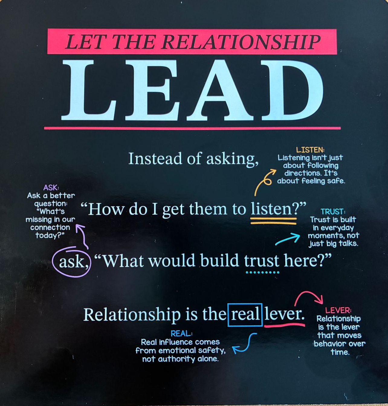 "Let the relationship lead" means your connection with your child comes before fixing behavior or winning arguments. When you're unsure what to do, you ask: "What choice best protects our relationship right now?"